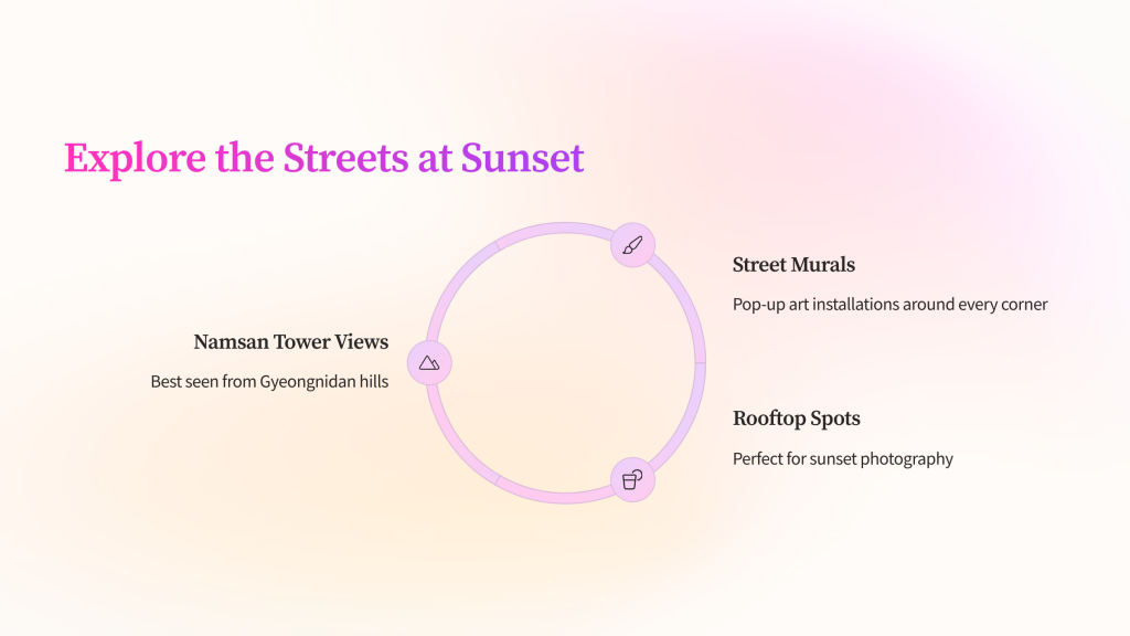 As the sun sets, Itaewon transforms. Neon signs glow, the streets come alive, and there’s a mix of languages, music, and street chatter in the air. Don’t miss:
