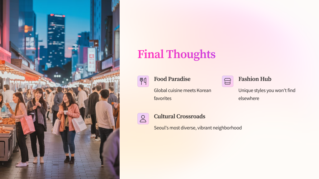 Itaewon isn’t just a neighborhood—it’s a vibe. Whether you’re into food, fashion, culture, or just soaking in Seoul’s diversity, Itaewon will leave you inspired and probably a little full. 😋